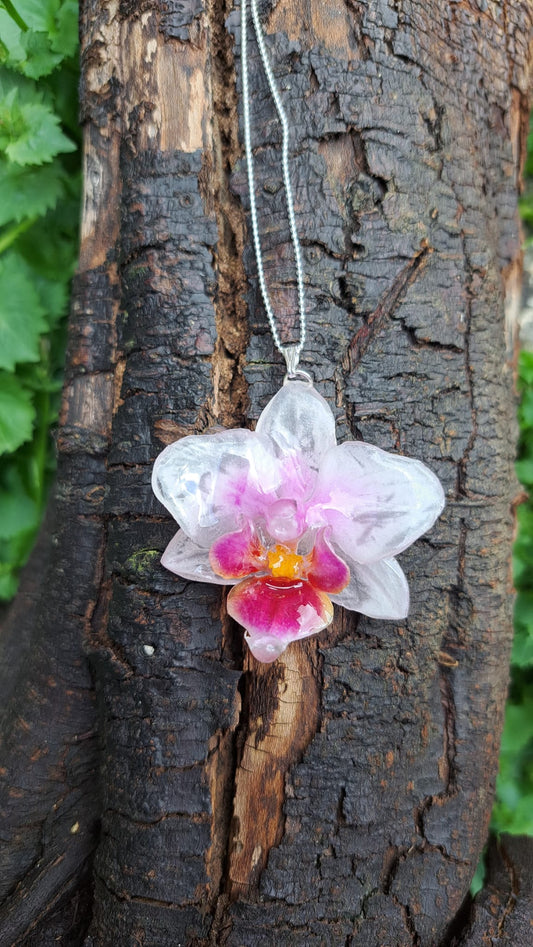 Artisan White Orchid Statement Necklace in Sterling Silver – 24" Chain – Hand-Preserved Botanical Jewelry