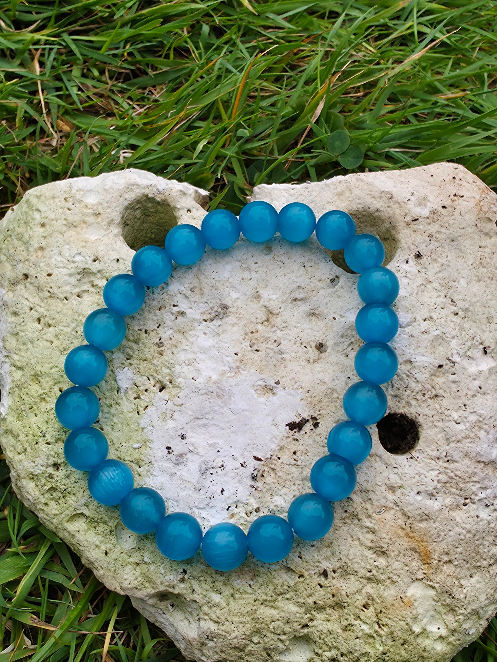 This stunning blue cat eye bracelet features 8mm beads made of cymophane, a translucent yellowish chatoyant chrysoberyl gemstone. Known for its mesmerizing 'cat's eye' effect, this bracelet is perfect for adding a touch of unique elegance to any outfit. Comes with a convenient gift bag for easy gifting.